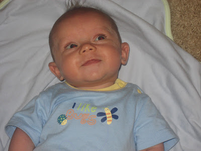 This baby is the sweetest little guy you ever did meet. He is content almost 100% of the time. He has started smiling and I caught a few on camera. The other day he was upset (very unusual) and I laid him on his tummy and all was better. His temperment is so darling. I feel very fortunate to have him.
